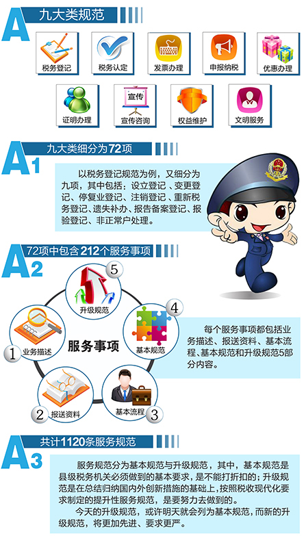 具体而言,《全国县级税务机关纳税服务规范》对税务登记、税务认定、发票办理、申报纳税、优惠办理、证明办理、宣传咨询、权益维护和文明服务9大类72项212个服务事项1120条纳税服务规范(包括基本规范和升级规范)进行了明确。其中,基本规范是县级税务机关必须做到的基础性服务规范,升级规范则是对县级税务机关服务要求的提升和服务发展方向的指引,各地可在达到基本规范的基础上因地制宜,稳步提升。