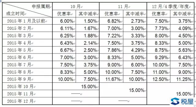2.减低税率税额=累计应税所得×5%×(新政施行日之前经营月份数/2015年度经营月份数)