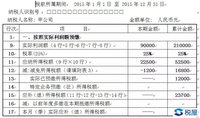 例:小型微利甲公司(查账征收,按季申报)2015年3月成立,3~12月累计利润额21万元(10~12月实现9万元),虽然该公司在新政施行日以前的利润只有12万元并未超过20万元,但其年度利润21万元已超过20万元为限的原“小小微企业”标准。其2015年经营月份数为10个月,新政施行日后的经营月份数3个月。2015年10月预缴3~9月税款时已按“小小微”优惠申报缴纳企业所得税1.2万元(享受优惠1.8万元),2016年1月预缴时这样填报: