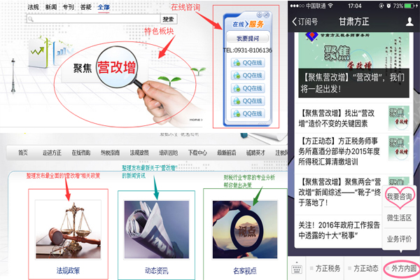 最后,你一定想随时随地地获取专家的支持和帮助,比如咨询一些相关问题,沟通一些想法,以及政策公布以后对这些政策文件的理解等等。在此方正税务师提供了一系列的互动平台,方正税务师师事务所官网“聚焦营改增”QQ在线咨询、电话咨询;甘肃方正公共微信平台在“内圆外方”中设立了“我要咨询”栏目方便手机用户。