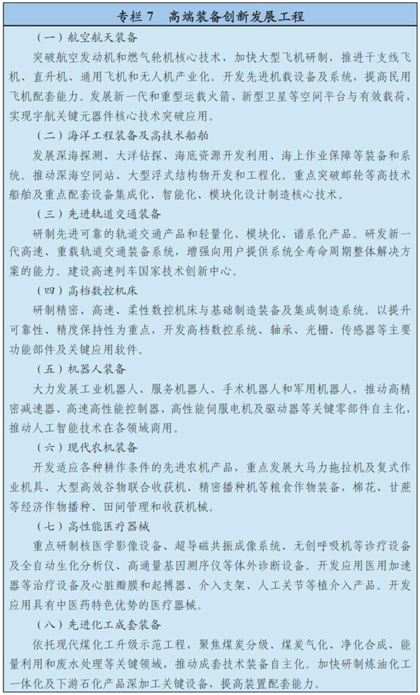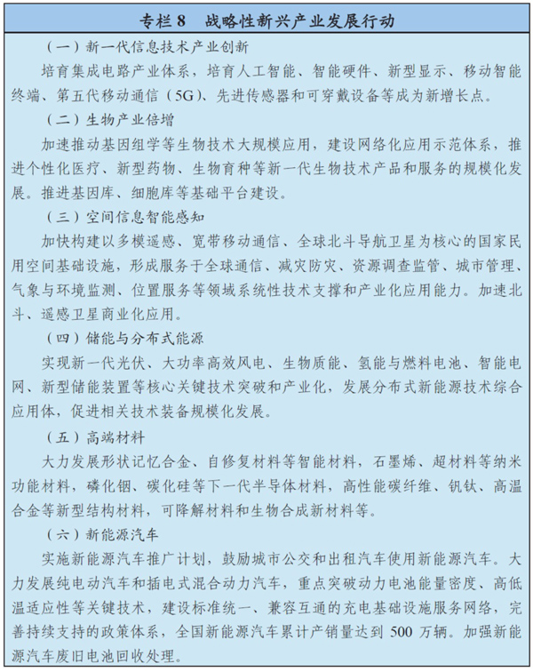支持新一代信息技术、新能源汽车、生物技术、绿色低碳、高端装备与材料、数字创意等领域的产业发展壮大。大力推进先进半导体、机器人、增材制造、智能系统、新一代航空装备、空间技术综合服务系统、智能交通、精准医疗、高效储能与分布式能源系统、智能材料、高效节能环保、虚拟现实与互动影视等新兴前沿领域创新和产业化,形成一批新增长点。