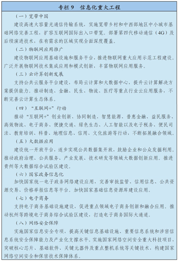 积极推进第五代移动通信(5G)和超宽带关键技术研究,启动5G商用。超前布局下一代互联网,全面向互联网协议第6版(IPv6)演进升级。布局未来网络架构、技术体系和安全保障体系。重点突破大数据和云计算关键技术、自主可控操作系统、高端工业和大型管理软件、新兴领域人工智能技术。