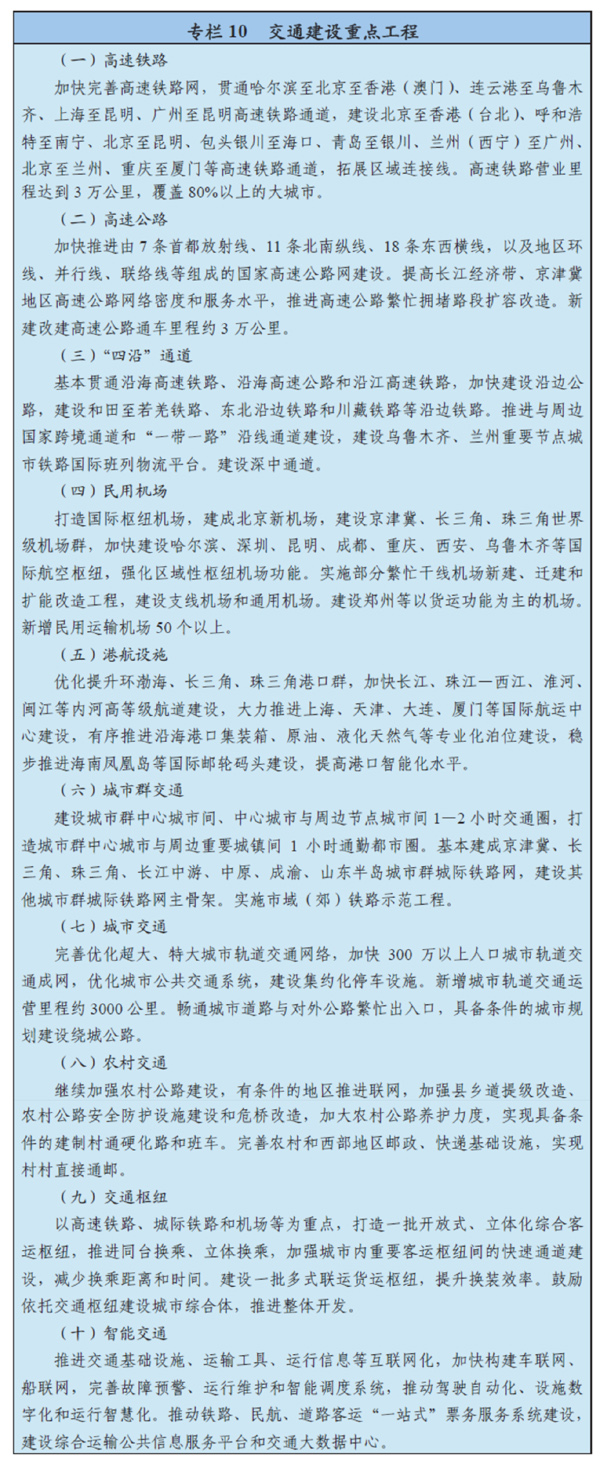 构建横贯东西、纵贯南北、内畅外通的综合运输大通道,加强进出疆、出入藏通道建设,构建西北、西南、东北对外交通走廊和海上丝绸之路走廊。打造高品质的快速网络,加快推进高速铁路成网,完善国家高速公路网络,适度建设地方高速公路,增强枢纽机场和干支线机场功能。完善广覆盖的基础网络,加快中西部铁路建设,推进普通国省道提质改造和瓶颈路段建设,提升沿海和内河水运设施专业化水平,加强农村公路、通用机场建设,推进油气管道区域互联。提升邮政网络服务水平,加强快递基础设施建设。