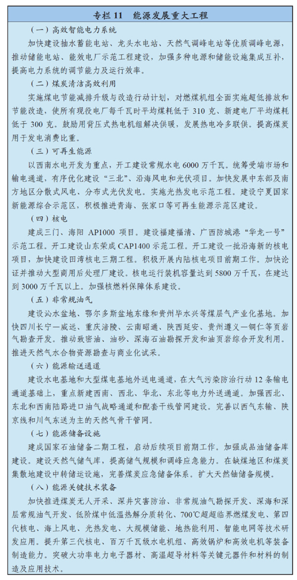 统筹水电开发与生态保护,坚持生态优先,以重要流域龙头水电站建设为重点,科学开发西南水电资源。继续推进风电、光伏发电发展,积极支持光热发电。以沿海核电带为重点,安全建设自主核电示范工程和项目。加快发展生物质能、地热能,积极开发沿海潮汐能资源。完善风能、太阳能、生物质能发电扶持政策。优化建设国家综合能源基地,大力推进煤炭清洁高效利用。限制东部、控制中部和东北、优化西部地区煤炭资源开发,推进大型煤炭基地绿色化开采和改造,鼓励采用新技术发展煤电。加强陆上和海上油气勘探开发,有序开放矿业权,积极开发天然气、煤层气、页岩油(气)。推进炼油产业转型升级,开展成品油质量升级行动计划,拓展生物燃料等新的清洁油品来源。