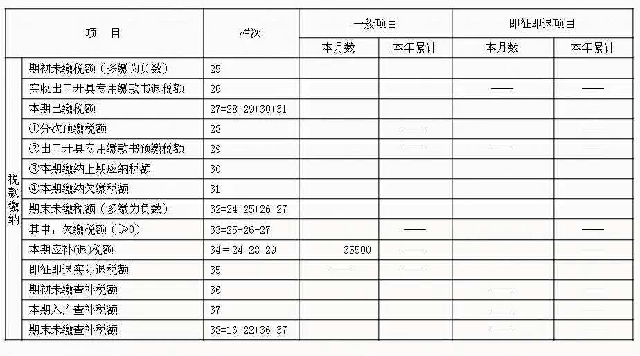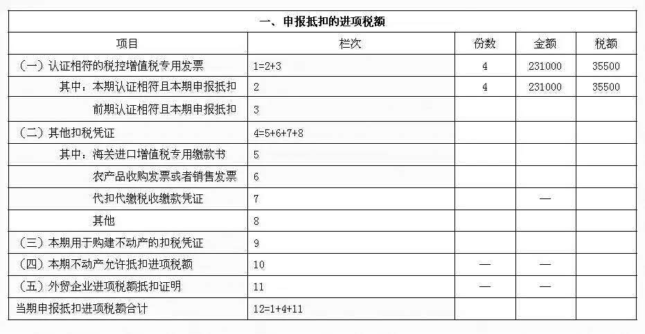 3、应抵扣税额合计(本月数)=进项税+上期留抵-进项税额转出=35500+0-1000=34500。