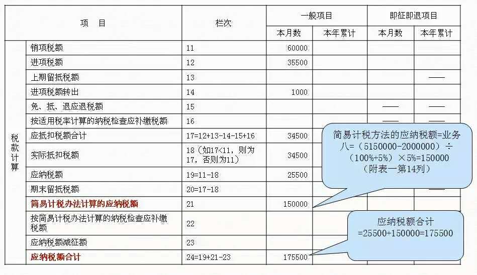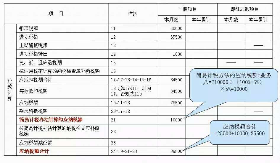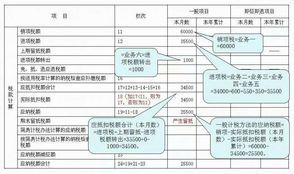 6、一般计税方法的应纳税额=销项-实际抵扣税额(本月数)-实际抵扣税额(本年累计)=60000-34500=25500。