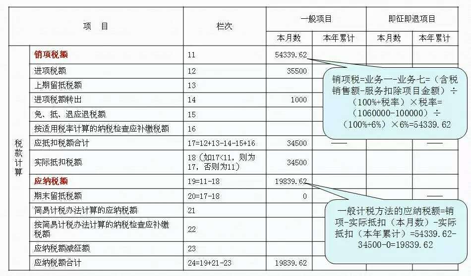 1、销项税=业务一=(含税销售额-服务扣除项目金额)÷(100%+税率)×税率=(1060000-100000)÷(100%+6%)×6%=54339.62