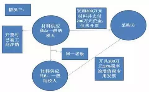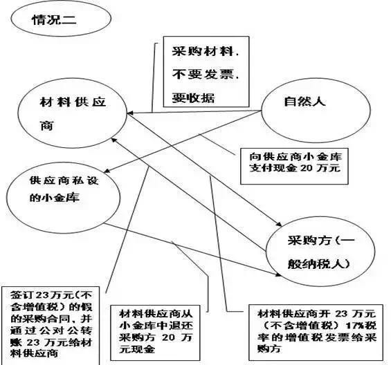 图中显示:采购方(一般纳税人)与材料供应商签订了一份假的采购合同23万元(不含增值税),并向材料供应商转账23万元,材料供应商向采购方(一般纳税人)开具23万元(不含增值税)17%税率的增值税专用发票,虽然有合同流、资金流、票流,但没有物流,实质上是采购方(一般纳税人)花了3万元从材料供应商手里买了一张真的增值税专用发票。这张23万元的增值税专用发票是虚开发票,不能在采购方抵扣增值税进项税额。
