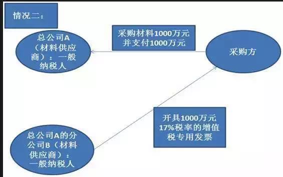 图中显示:收款方、销售方是一般纳税人的材料供应商总公司A,发票开具方是总公司A的分公司B,出现了销售方、收款方和开具方不是同一个单位的情况,采购方获得的一张1000万元的增值税专用发票不可以抵扣增值税进项税金,而且该开票行为是一种虚开增值税专用发票的行为。