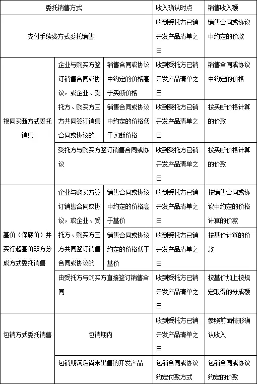 4.采取委托方式销售开发产品的,原则上于收到受托方已销开发产品清单之日起确认销售收入,在此基础上又区分为以下情形确认销售收入: